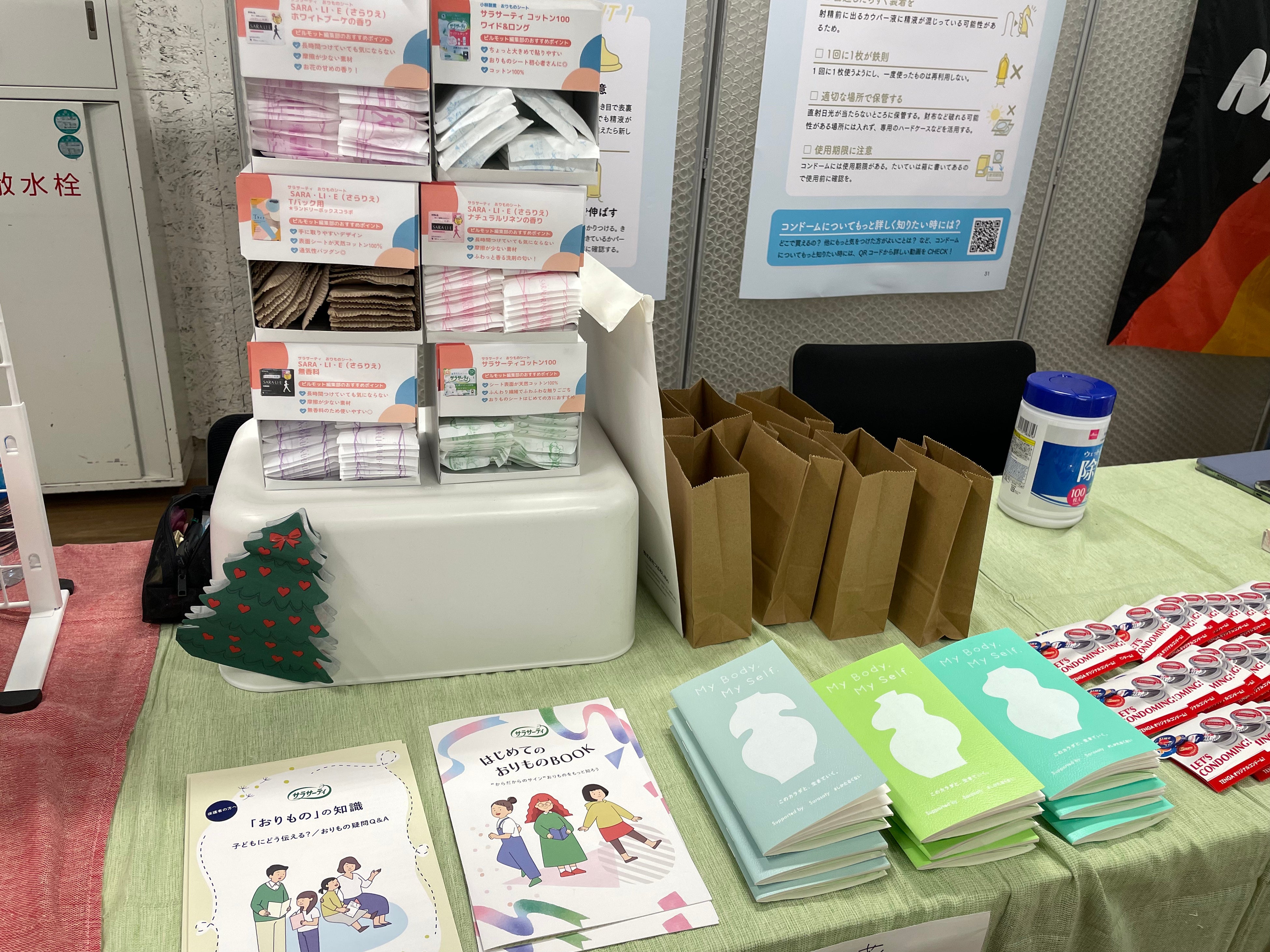 小林製薬様からご提供いただいた、サラサーティのおりものシートとおりものについて伝える冊子を配布させていただきました。様々な種類のおりものシートを配布し、大好評でした。おりものは月経に比べて知るきっかけが少ないため、興味を示す方が多い印象でした。また、体について話すチャンスになるという保護者の声も聞かれました。