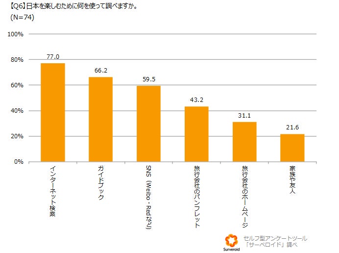 日本について何を使って調べるかを聞いたところ、「インターネット検索(77.0%))」が最も多く、次いで「ガイドブック(62.2%)」、「SNS(59.5%)」となりました。
