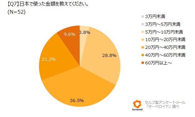 日本で使った金額を聞いたところ、「20万円~40万円未満(36.5%))」が最も多く、次いで「10万円~20万円未満(28.8%)」、「40万円~60万円未満(21.2%)」となりました。