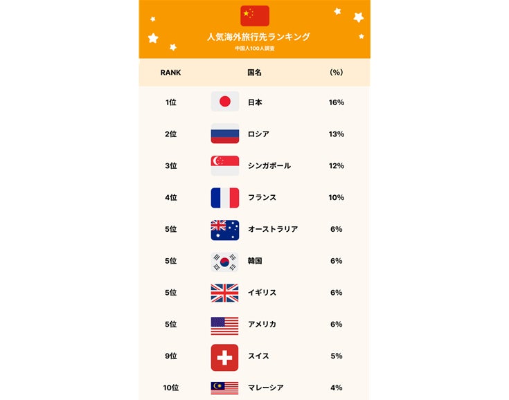 海外旅行先について、最も行きたい国を聞くと「日本」が1位という結果になり、2位「ロシア」、3位「シンガポール」となりました。