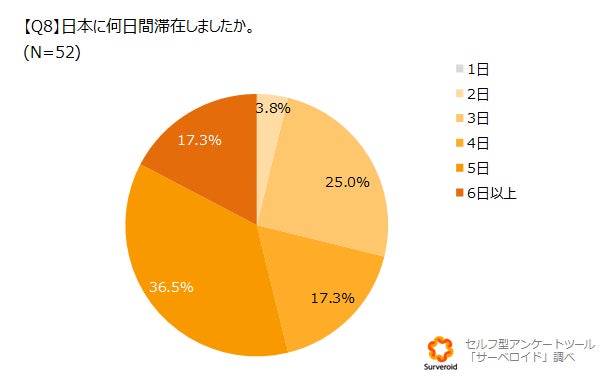 日本での滞在期間は「5日(36.5%)」が最も多く、次いで「3日(25.0%)」となっており、滞在期間は長めの印象を受けます。