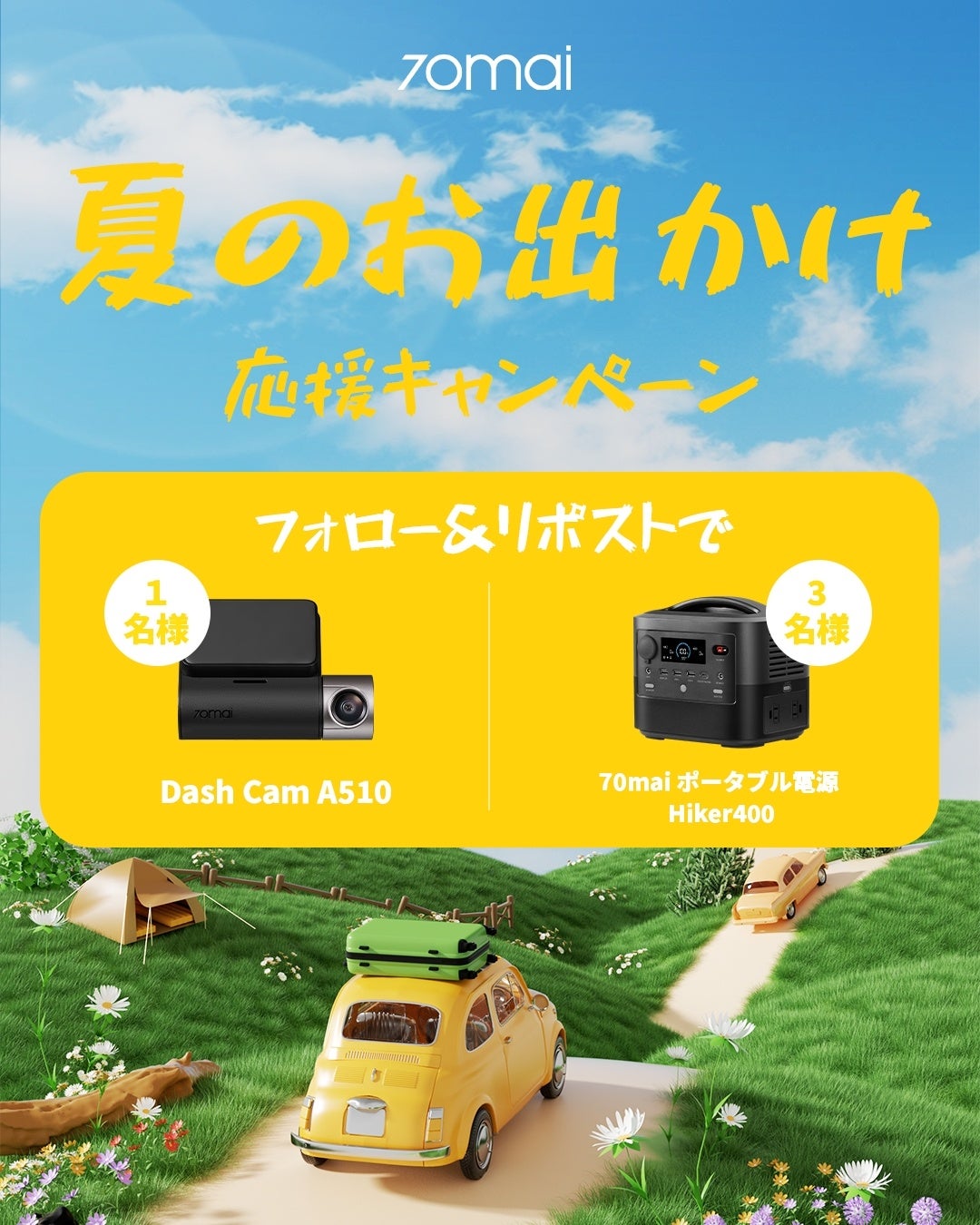 抽選で3名様に70mai ポータブル電源 Hiker400、 1名様にDash Cam A510をプレゼントします!