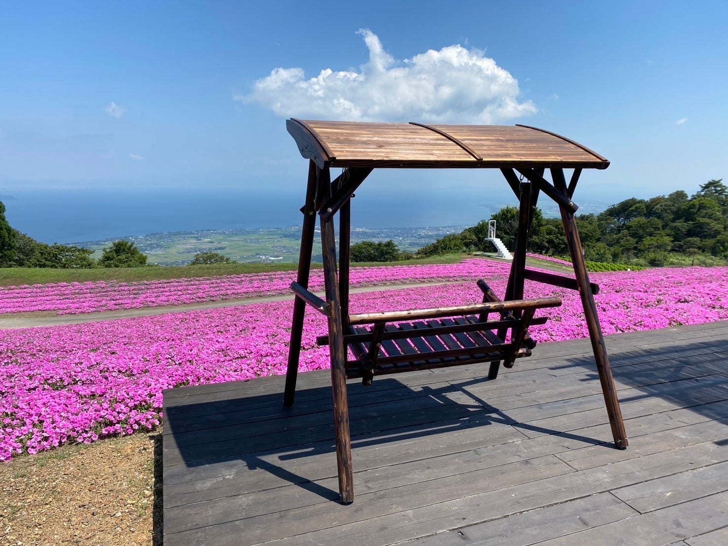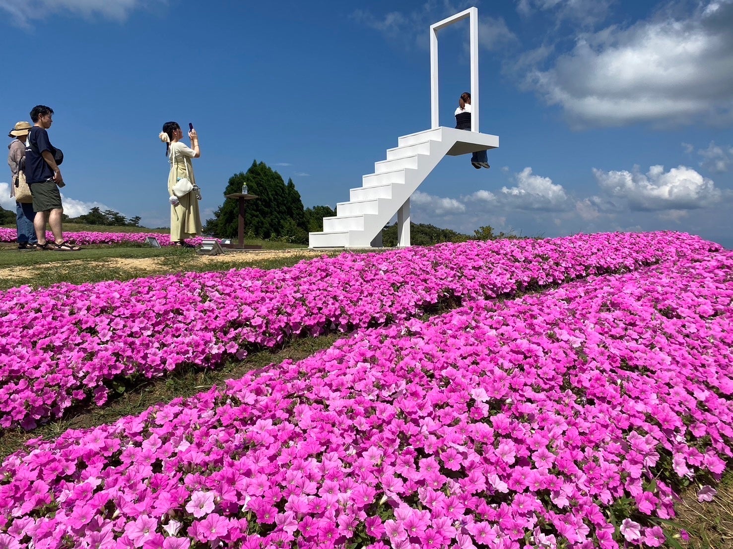 グリーンコキアの隣には、一面を埋め尽くすペチュニア「桃色吐息」が広がり、山頂を鮮やかなピンク色に染め上げます。まるで桃色の海のように広がる花畑とびわ湖ブルーとのコントラストは、びわこ箱館山だけで見られる絶景です。