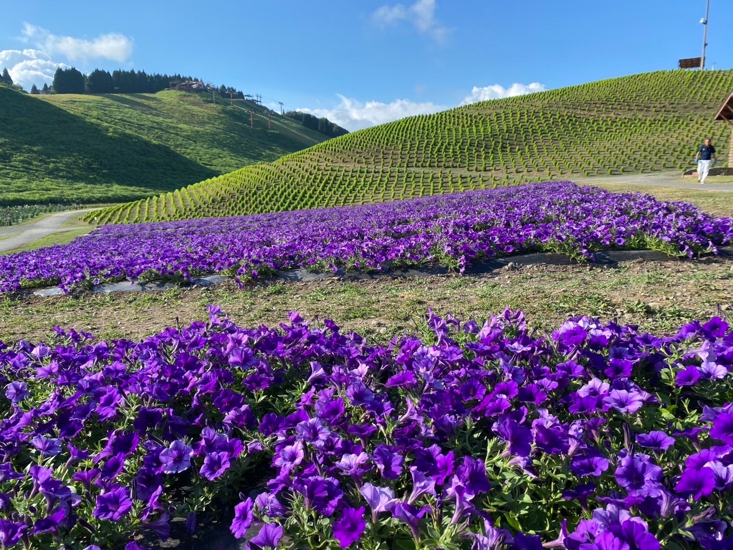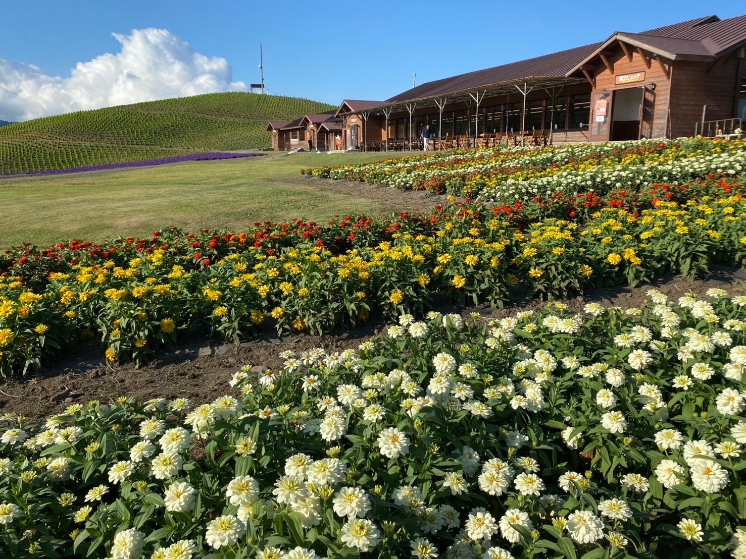 箱館山の花畑では、ペチュニアやコキアのほかにも、日日草、ジニア、マリーゴールド、サンパチェンスなど夏の花々が次々と咲き誇り、山頂を華やかに彩ります。訪れるたびに表情を変える花の風景が楽しめます。