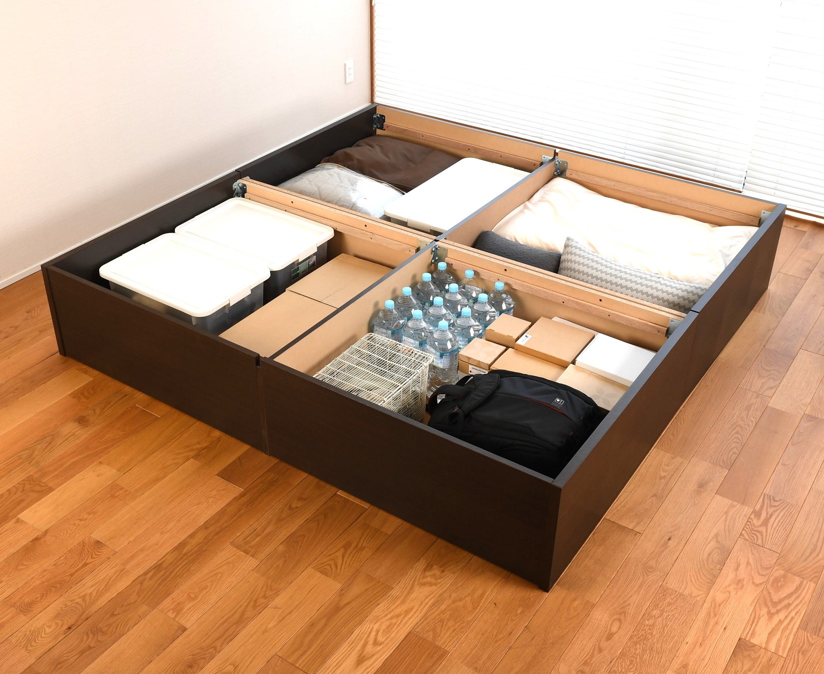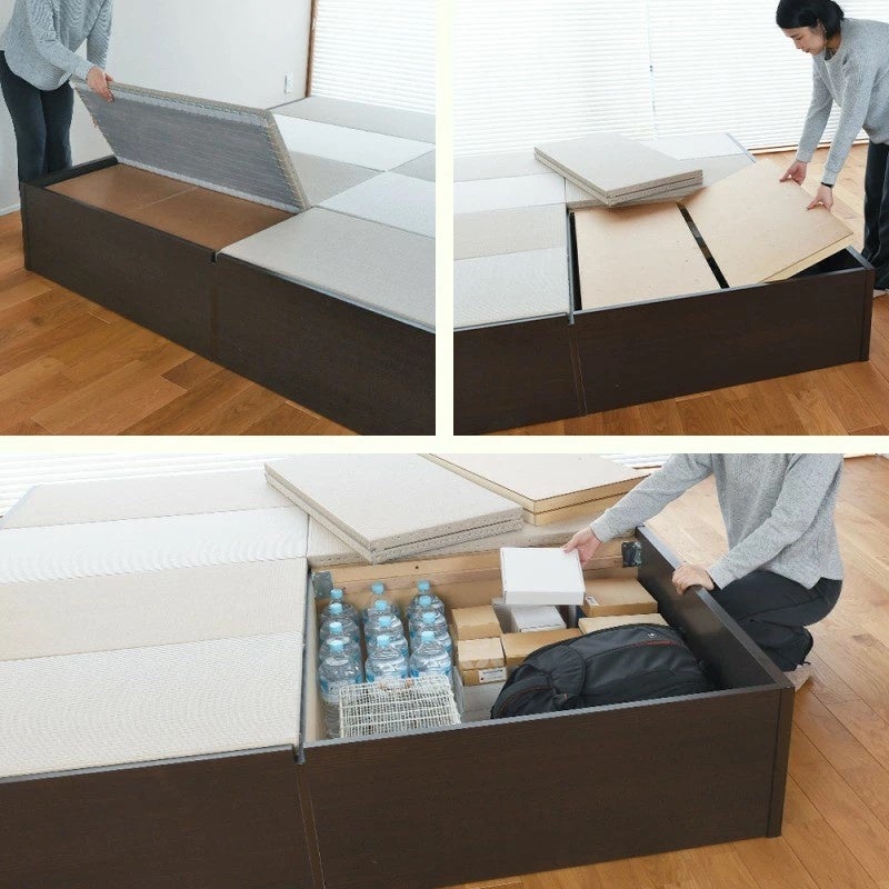 畳と床板を外せば、便利な収納スペースが出現。シーズンオフの物や普段あまり使わない物の収納におすすめ。特別な道具もなく簡単に開閉できます。