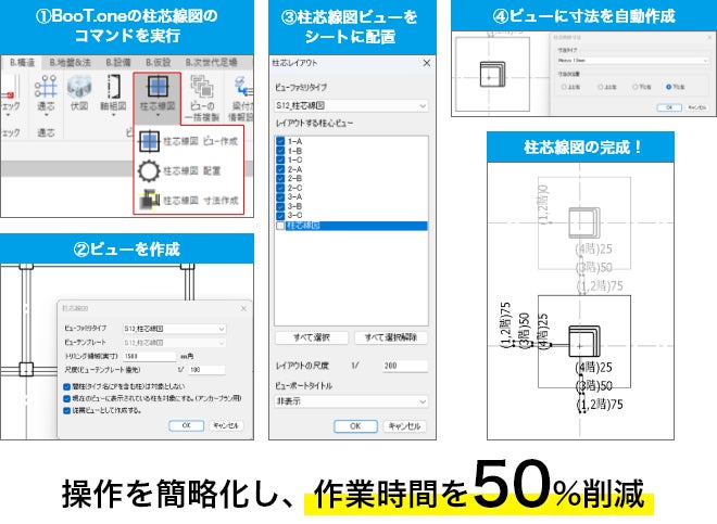 竹中工務店では、BooT.oneを活用することで、Revitでの構造図作成の効率化を実現しました。例えば、柱芯線図の作成においては、従来の作業時間を50%以上削減することに成功しています。