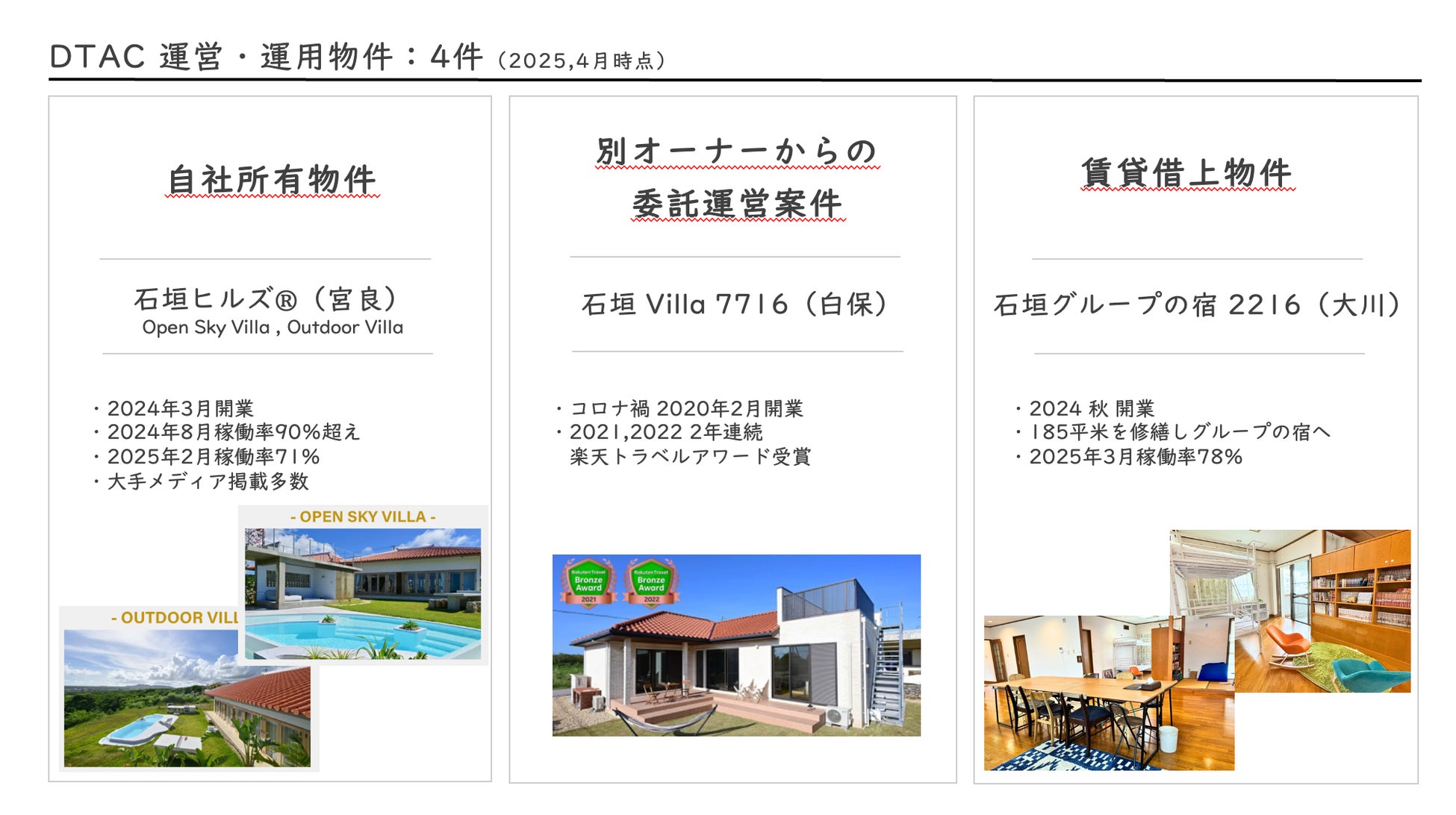 今後は、賃貸物件等施設の再生・プロデュースに加え、デジタルマーケティングノウハウを活かした宿泊施設のウェブ支援や運営代行などを行いながら、第2・第3の「石垣ヒルズ®」オープンを推進してまいります。