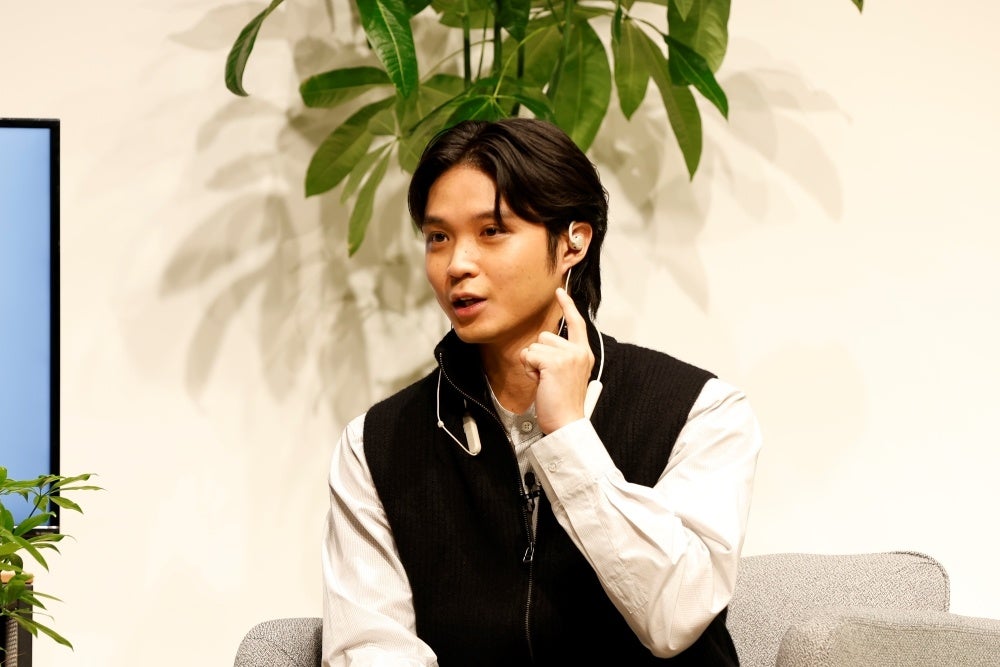 nwmのCM を初披露したのちに、出演している磯村勇斗さんをゲストとしてお迎えし、実際に「耳スピ」を着けながらトークセッションを行いました。新体験「耳スピ」に驚く様子が印象的な本CM。実際にCM撮影時に初めて「耳スピ」を体験したという磯村さんは、着け心地について『本当に軽くて、着けているのに着けていないような不思議な感覚です。撮影時、控室にいるときにも着けていたのですが、それすら忘れていて。スタッフの方に呼ばれて、着けているのに「耳スピ着けなくちゃ!」となりました(笑)。本当にストレスフリーですごいです。熱弁したいくらいです!それくらい着け心地が良くて、もはや身体の一部です。』とコメント。