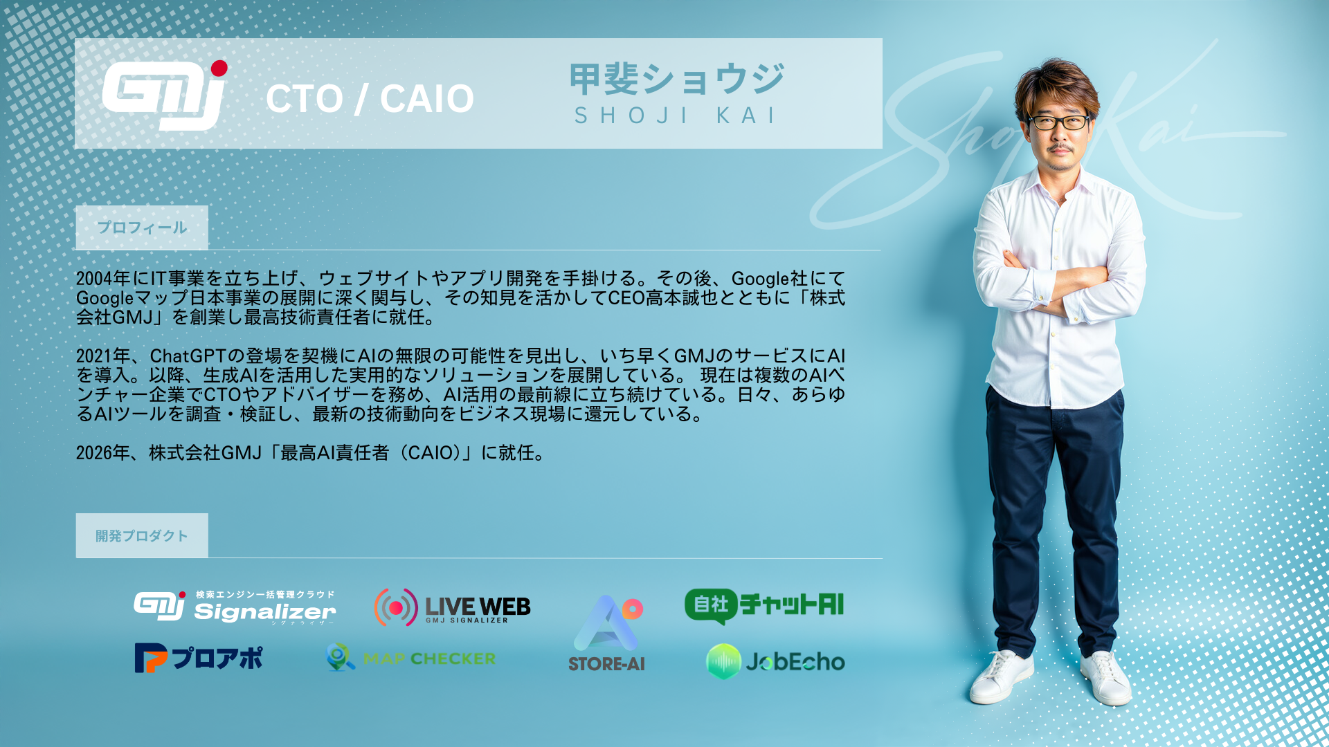 株式会社GMJ(本社:東京都港区、代表取締役CEO:高本誠也、以下「当社」)は、AI技術の戦略的活用を加速させるため、CAIO(Chief AI Officer:最高AI責任者)ポストを新設し、創業者兼取締役CTOの甲斐ショウジが就任したことをお知らせいたします。