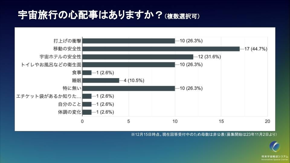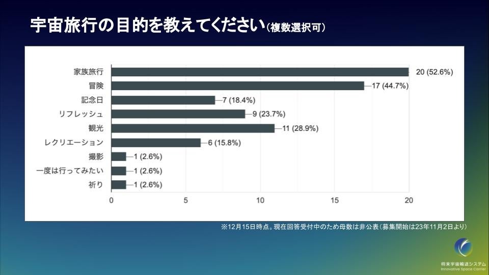 11月に開催されたSPACE WEEKから募集を開始し、すでに幅広い年代から回答をいただいています。今後、回答いただいたアンケート結果をもとに、宇宙旅行に関する情報分析・事業検討を進めてまいります。