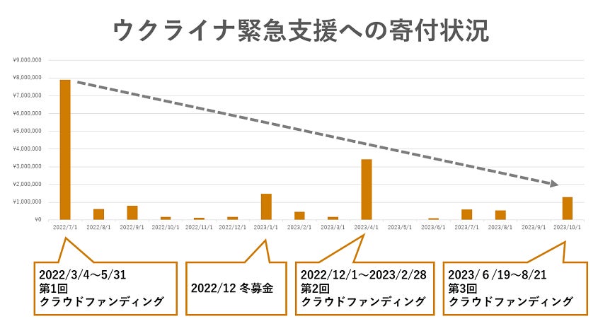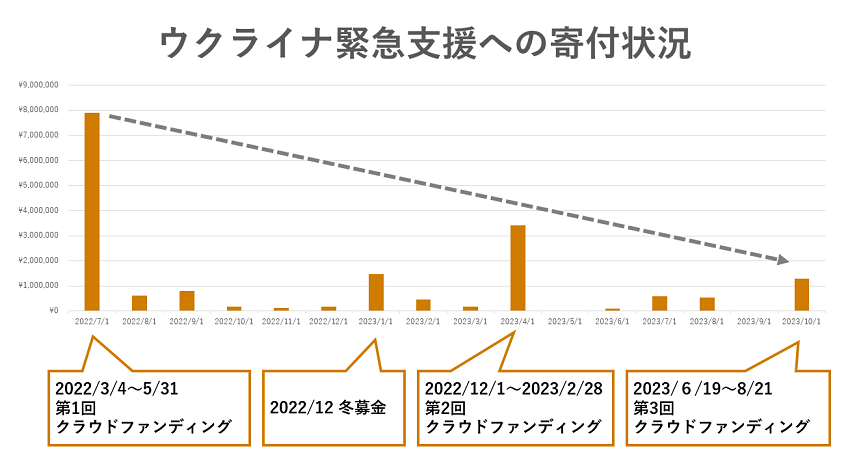 国際NGO「CARE」は、少なくとも2025年3月まで現地での支援活動を継続することを決定しているも、事態の長期化・深刻化による支援ニーズの変化と拡大により、活動資金が足りていないとしている。また、世界各地で頻発する紛争や自然災害の発生により、ウクライナ支援への急激な国際社会の関心の低下が懸念されている。同財団においても、ウクライナ侵攻が始まった2022年2月直後には非常に高い関心が示され、多くの支援が寄せられたものの、その後、ウクライナへの寄付金の集まりは、下降の一途を辿っており、大きな危機感を抱いているという。
