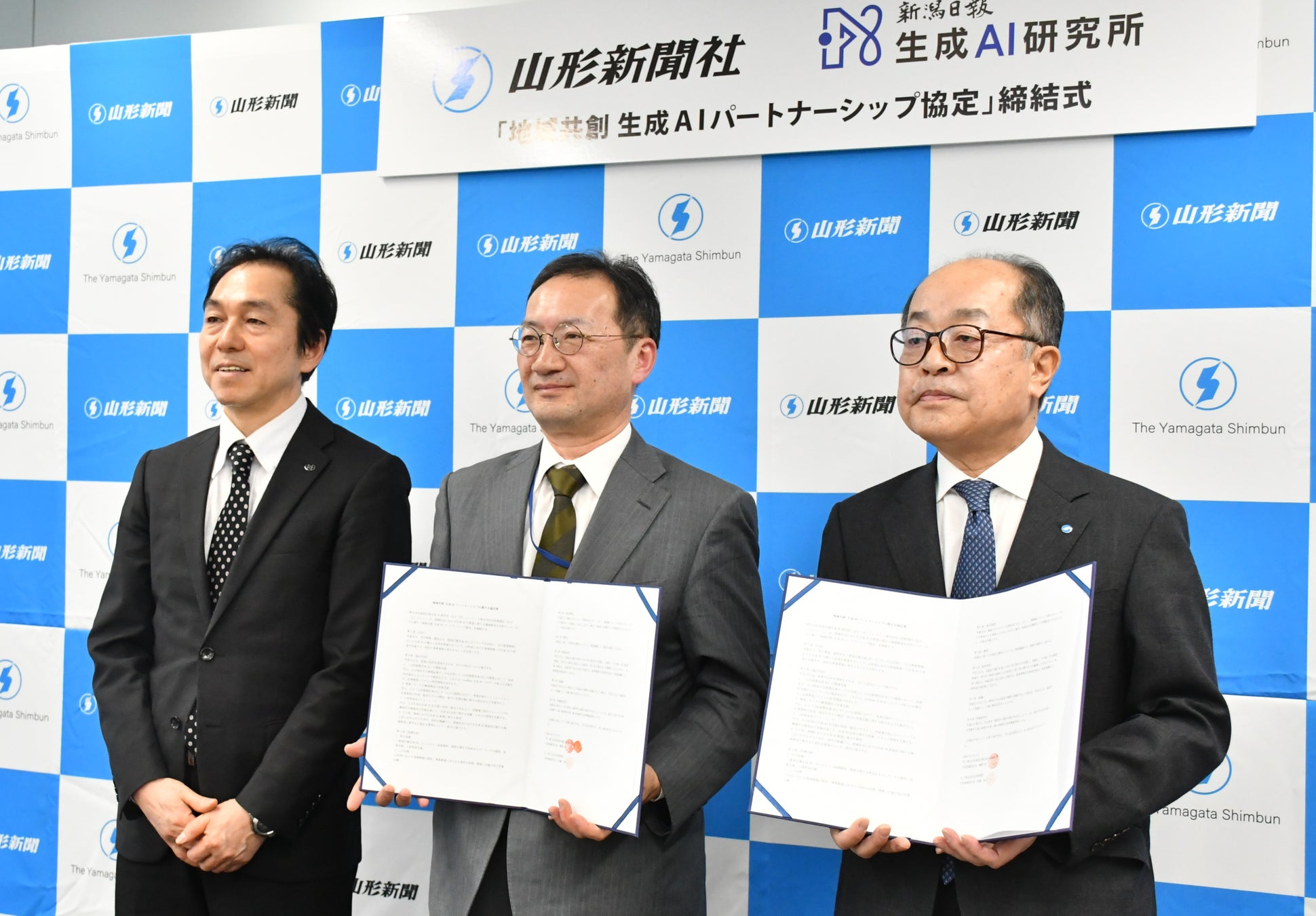 株式会社山形新聞社(本社・山形市、佐藤秀之代表取締役社長)は2日、株式会社新潟日報生成AI研究所(本社・新潟市、鶴間尚代表取締役社長)と「地域共創 生成AIパートナーシップ協定」を締結しました。