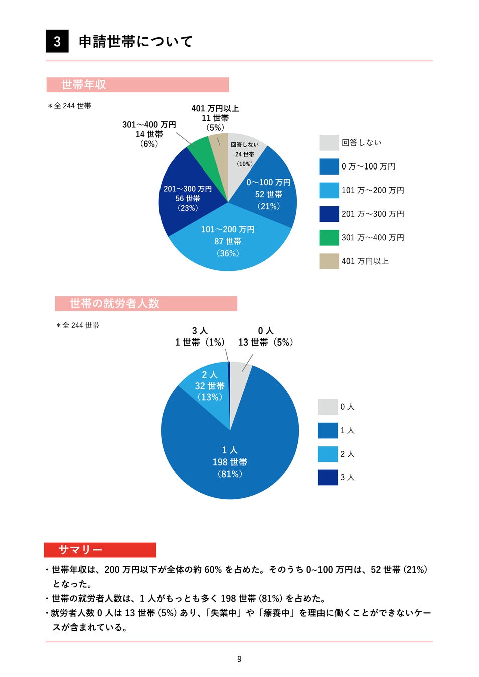 - 申請世帯のうちひとり親世帯が85%。二人親だが実質ひとりで育てている世帯は10%。