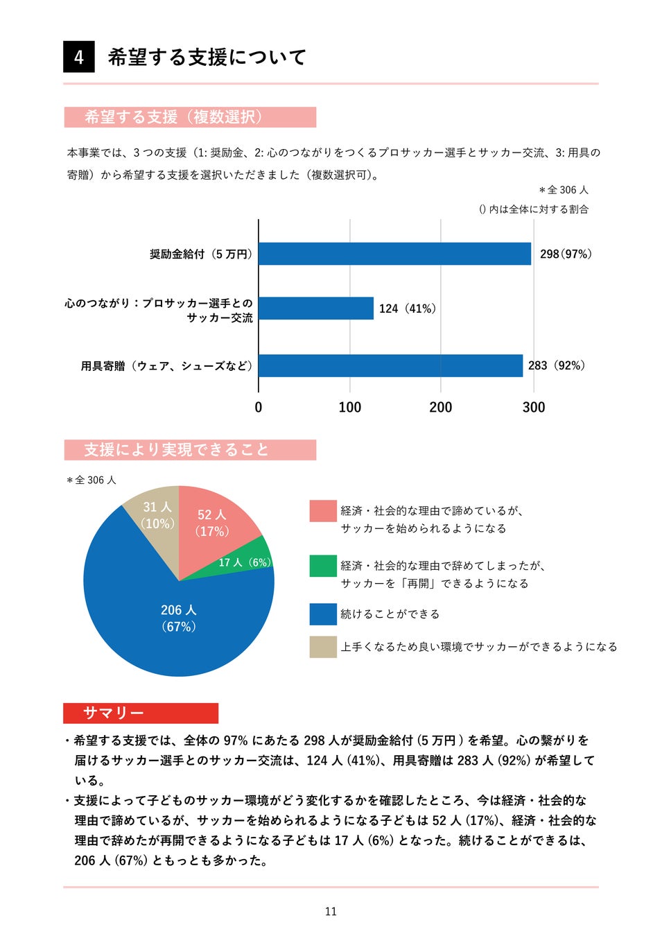 この速報版の報告書は、スポーツの機会格差問題の課題を可視化し日本スポーツ界と共有するため、申請者の状況をまとめた「REPORT(速報版)」と、「サッカーがしたい」という子どもたちの声をまとめた「HOPE(希望)」の2部構成になっています。
