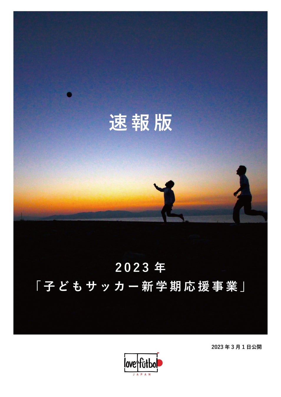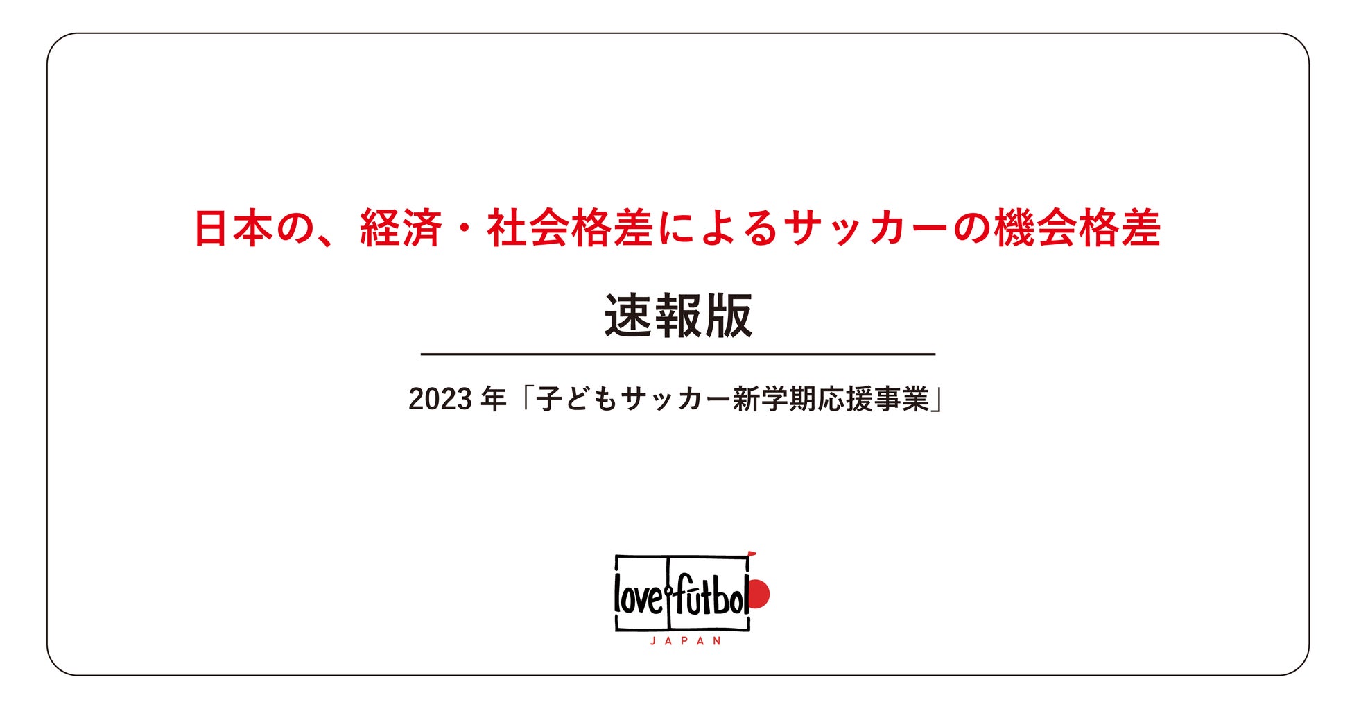 NPO法人「love.futbol Japan」は、家庭の経済的負担が大きくなる新学期に合わせて、経済的な貧困や社会格差を理由に、サッカーをしたくても諦める、続けることが困難な子どもたちを応援する活動「子どもサッカー新学期応援事業」の募集を行いました。結果、37都道府県244世帯より申請いただき、支援を希望する子どもはこの2年間で3倍に増加し、306人となりました。速報版の報告書では、申請者の状況と「サッカーがしたい」という子どもたちの声をまとめています。