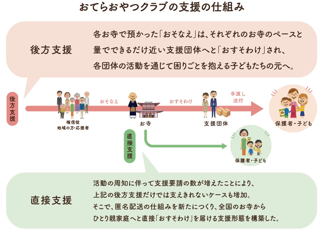 おてらおやつクラブは、全国の子どもの貧困問題の解決を目指し、お寺にお供えされるさまざまな「おそなえ」を、仏さまからの「おさがり」として頂戴し、子どもをサポートする支援団体の協力の下、さまざまな事情で困りごとを抱えるひとり親家庭へ「おすそわけ」する活動です。