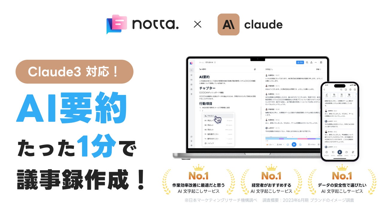 AI文字起こしサービス「Notta」が最新AIモデル「Claude 3」に対応!
