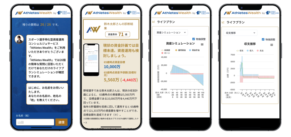 アスリートウェルスは、スポーツ選手が現役中や引退後でもお金の不安を感じずにいられるよう、独自の分析ツールや資産運用のアドバイザーによるサポートを提供する、スポーツ選手特化型の金融サービスです。はじめに、当社独自のAI ChatBotを使って26個の質問に答えることで、簡易診断結果を得られます。このデータを元に、希望者にはファイナンシャルアドバイザーによる面談やライフプランの設計におけるアドバイスを受けることができます。資産運用開始後にも、ユーザーは自身の資産運用状況やシミュレーションをマイページのポータルから確認できるだけでなく、定期的なフィードバックやポートフォリオの見直しなど、担当者が顧客と伴走して長期的なサポートを行います。