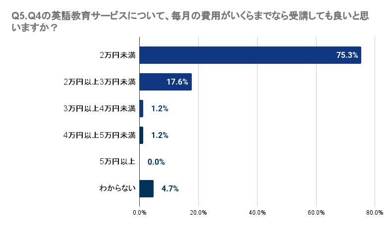 Q4で「受講したい」「料金が安ければ受講したい」「興味がある」と回答した人に、Q5で、「Q4の英語教育サービスについて、毎月の費用がいくらまでなら受講しても良いと思いますか?」と質問したところ、最も多い75.3%の回答者は2万円未満が適切と感じています。17.6%は2万円以上3万円未満、1.2%は3万円以上4万円未満と答えました。対照的に、4万円以上の費用を考える回答者は極少数で、4万円以上5万円未満が1.2%、5万円以上が0.0%でした。これにより、和歌山県では多くの人が3万円未満の価格帯を望んでいることが明らかとなりました。
