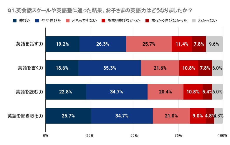 Q1で「英会話スクール、英語塾に通った結果、お子さまの英語力はどうなりましたか?」と質問したところ、和歌山県では英会話スクールや塾に通って英語のスキル向上を明確に感じられなかったと感じている人が一定数いることが分かりました。具体的には、英語を話す、書く、読む、聞き取る各スキルにおいて、「伸びた」と感じる人は約19%~26%であり、一方で「あまり伸びなかった」や「まったく伸びなかった」と回答した人が合わせて約14%〜19%となっています。特に、「英語を話す力」と「英語を書く力」においては「あまり伸びなかった」と「まったく伸びなかった」の合計がそれぞれ19.2%、18.6%となっています。また、各スキルに関して「どちらでもない」と答えた人も含めると、約35%~45%となっており、明確な効果を実感していない人が一定数存在することが伺えます。