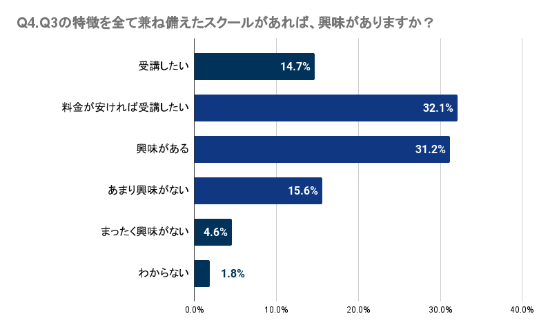 Q4で「Q3の特徴を全て兼ね備えたスクールがあれば、興味がありますか?」と質問したところ、和歌山県では14.7%が受講を希望し、32.1%は料金が手頃であれば受講したいと考えています。さらに、31.2%は興味を示していると回答しました。多くの人がこのような特徴を持つスクールに一定の興味を示していることが分かります。