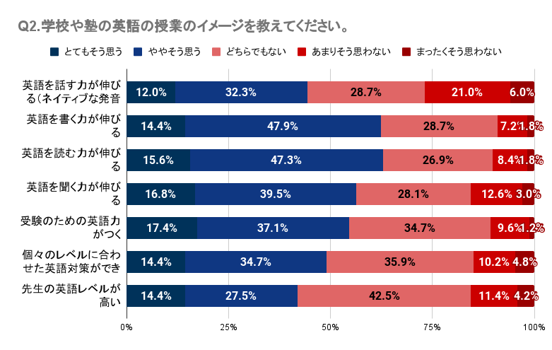 Q1・Q2では、子どもが英会話スクールや英語塾に通っていたが英語力アップの効果を感じていない人が一定数いること、学校や塾の英語の授業に対して明確な効果や良い印象を持てていない人が多いことが明らかになりました。