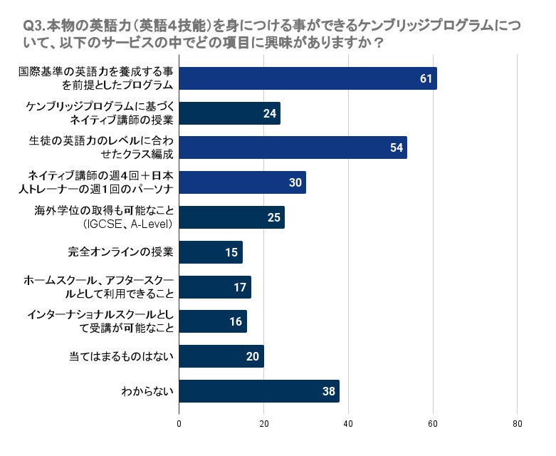 Q3で「本物の英語力(英語4技能)を身につける事ができるケンブリッジプログラムについて、以下のサービスの中でどの項目に興味がありますか?(複数回答可)」と質問したところ、和歌山県で最も多かったのは「国際基準の英語力を養成する事を前提としたプログラム」で61名でした。次いで、「生徒の英語力のレベルに合わせたクラス編成」には54名、「ネイティブ講師の週4回+日本人トレーナーの週1回のパーソナルトレーニング」には30名が興味を持っています。一方で、「完全オンラインの授業」や「インターナショナルスクールとして受講が可能なこと」に関心を持つ人はやや少なめで、それぞれ15名、16名の回答でした。これらの結果から、多くの人は実用的な英語力の養成や個別のニーズに応じた指導に重きを置いていることが伺えます。