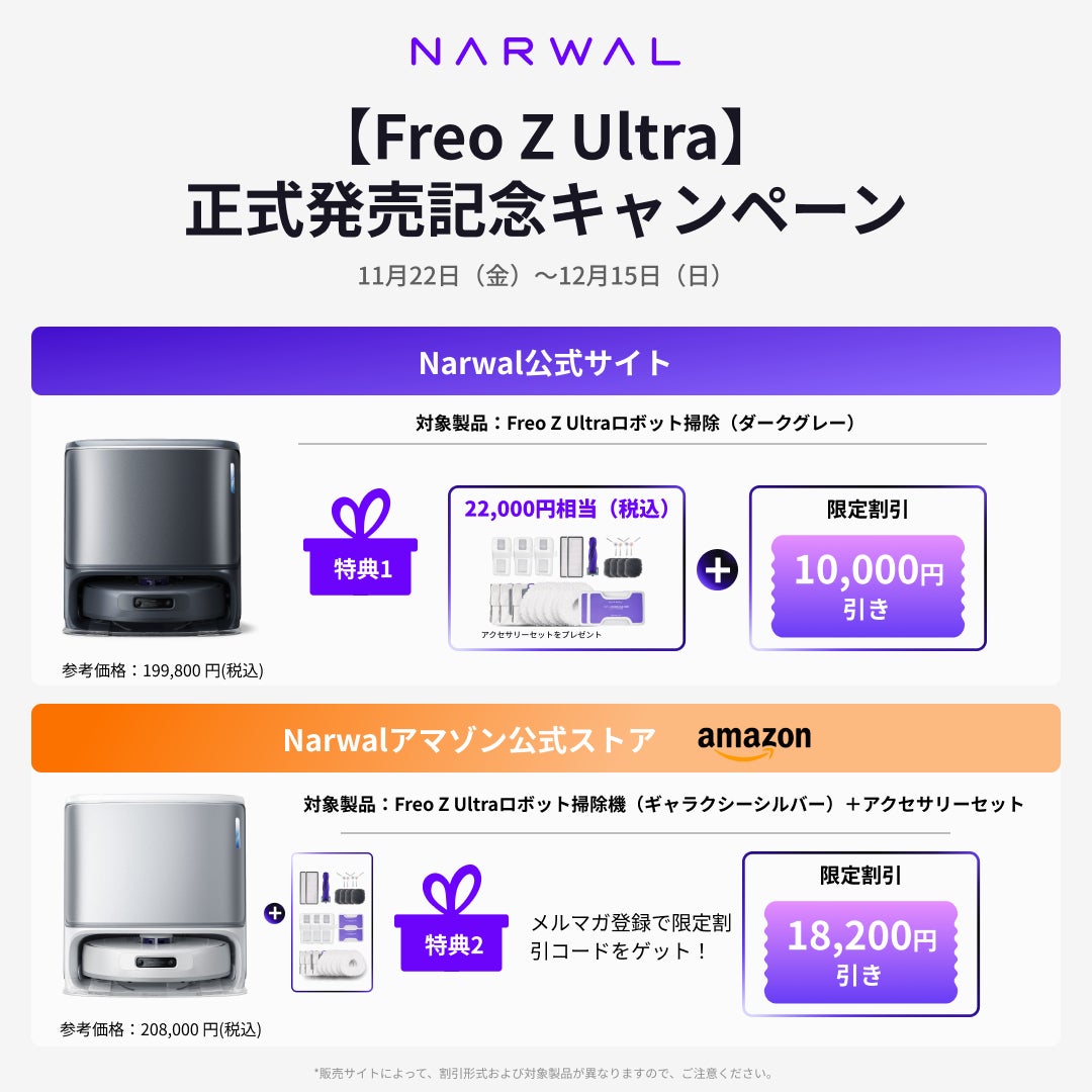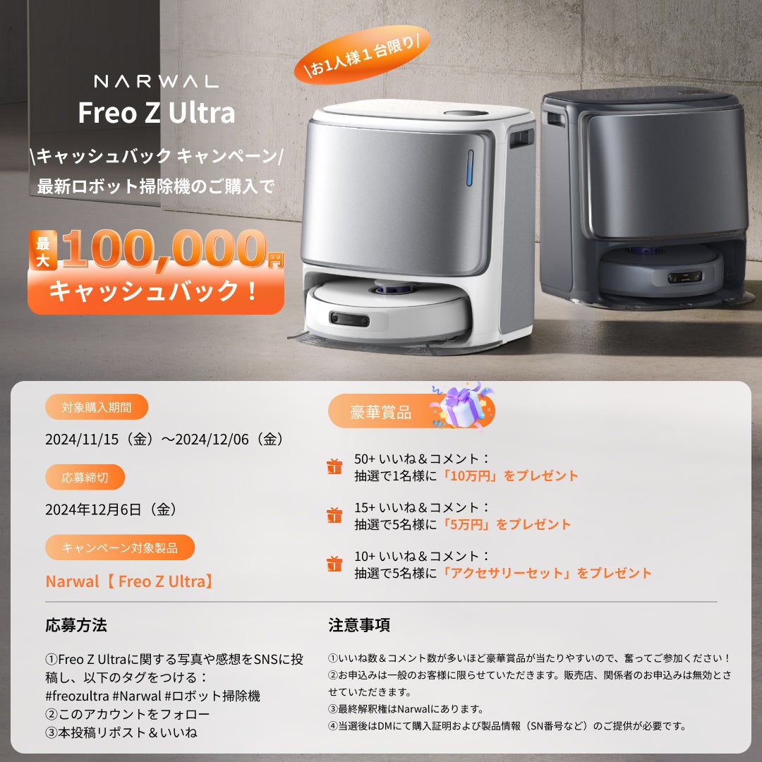 Narwal Freo Z Ultra の発売を記念して、Narwal Japanでは公式サイトおよびAmazonにて期間限定の特別キャンペーンを実施中です。また公式SNSでも最大10万円の現金をゲットするキャッシュバックキャンペーンを開催中!ぜひお見逃しなく!