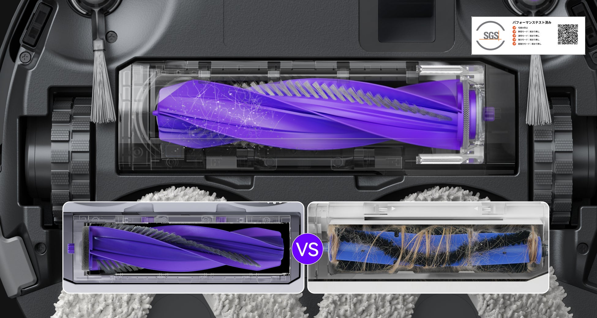 スイスのSGS社により、「全モードの吸引時、髪の毛や糸くずの絡まり率が0%である」ことを認定されたブラシは、たとえ分厚いカーペットが相手でも一切の毛が絡まることがありません。これにより、ただお手入れの手間が省けるだけではなく、製品の耐久性も大幅に向上します。
