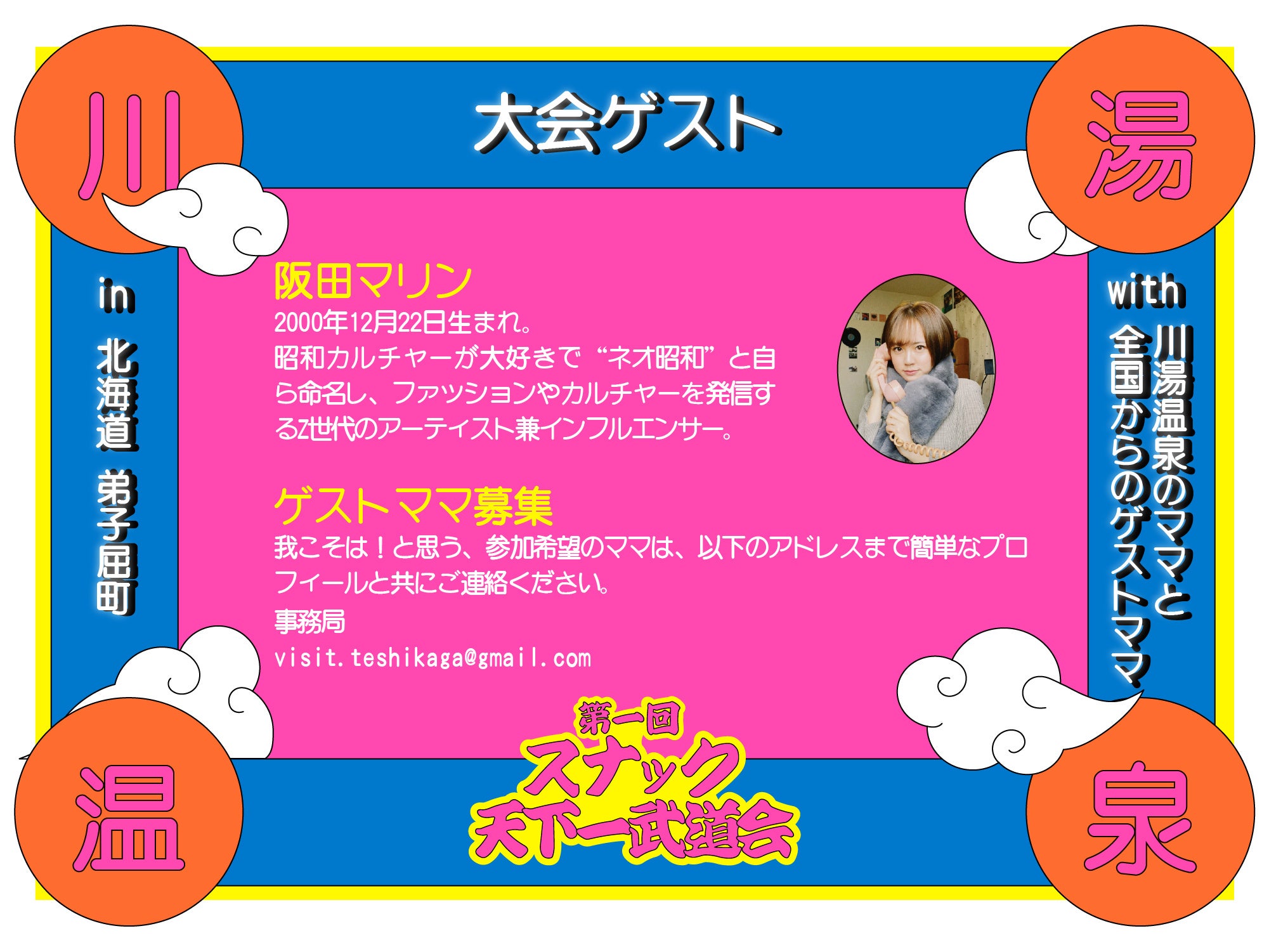 「第一回スナック天下一武道会」とは、川湯温泉における昭和の文化遺産であるスナック文化を、次世代へに継承することを目的としたイベント。当日はゲストに、“ネオ昭和”と自ら命名し、ファッションやカルチャーを発信するZ世代のアーティスト兼インフルエンサーの阪田マリンも出演します。