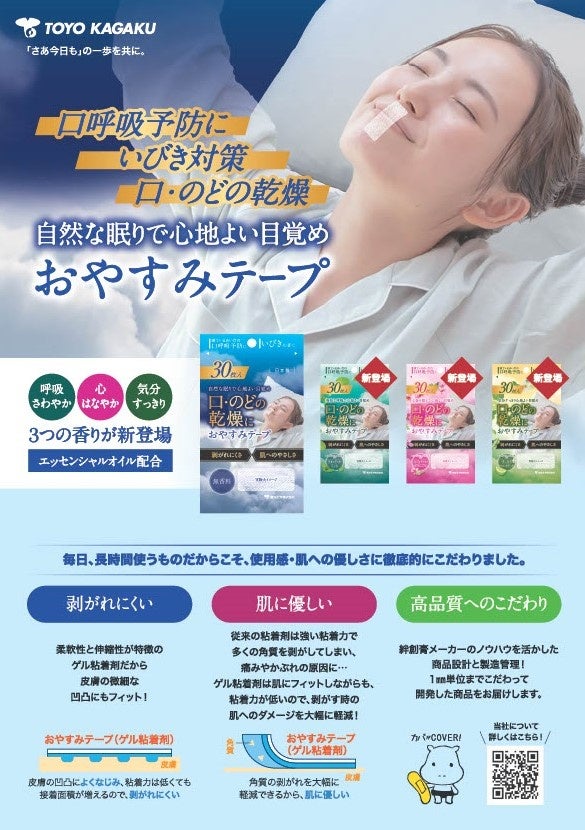 東洋化学株式会社(本社:滋賀県蒲生郡日野町 代表取締役:岡 幸一)は、今まで培ってきた救急絆創膏の技術を活かし開発した、いびき対策や、口・のどの乾燥を防ぐ「おやすみテープ」に、3つの香りをプラス。2024年 10月より全国のドラッグストア等で発売を開始いたしました。