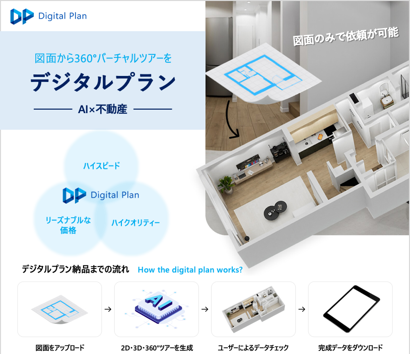 これま不動産広告用写真のCG加工デジタルステージングを主力商品としてきたが、今回新サービスとして建築図面から360°バーチャルツアーを安価にスピード納品可能なデジタルプランをリリース