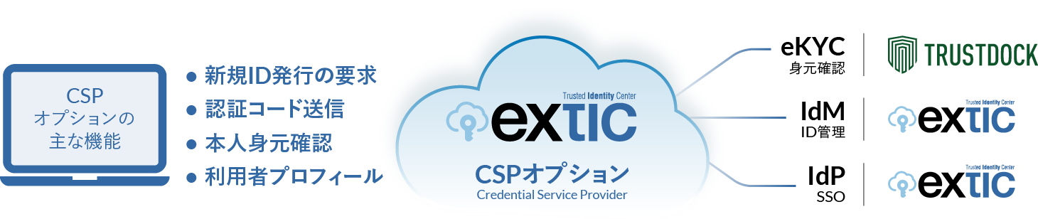Extic CSPオプションは、サインアップする際に利用者が身分証明書を添付することができ、その情報をeKYCサービスであるTRUSTDOCKとオンラインで連携し、TRUSTDOCKにて判定した結果、承認された場合にのみExticの利用者としてIDが自動的に発行されるしくみとなり、外部機関との共同作業場面での課題を解決します。