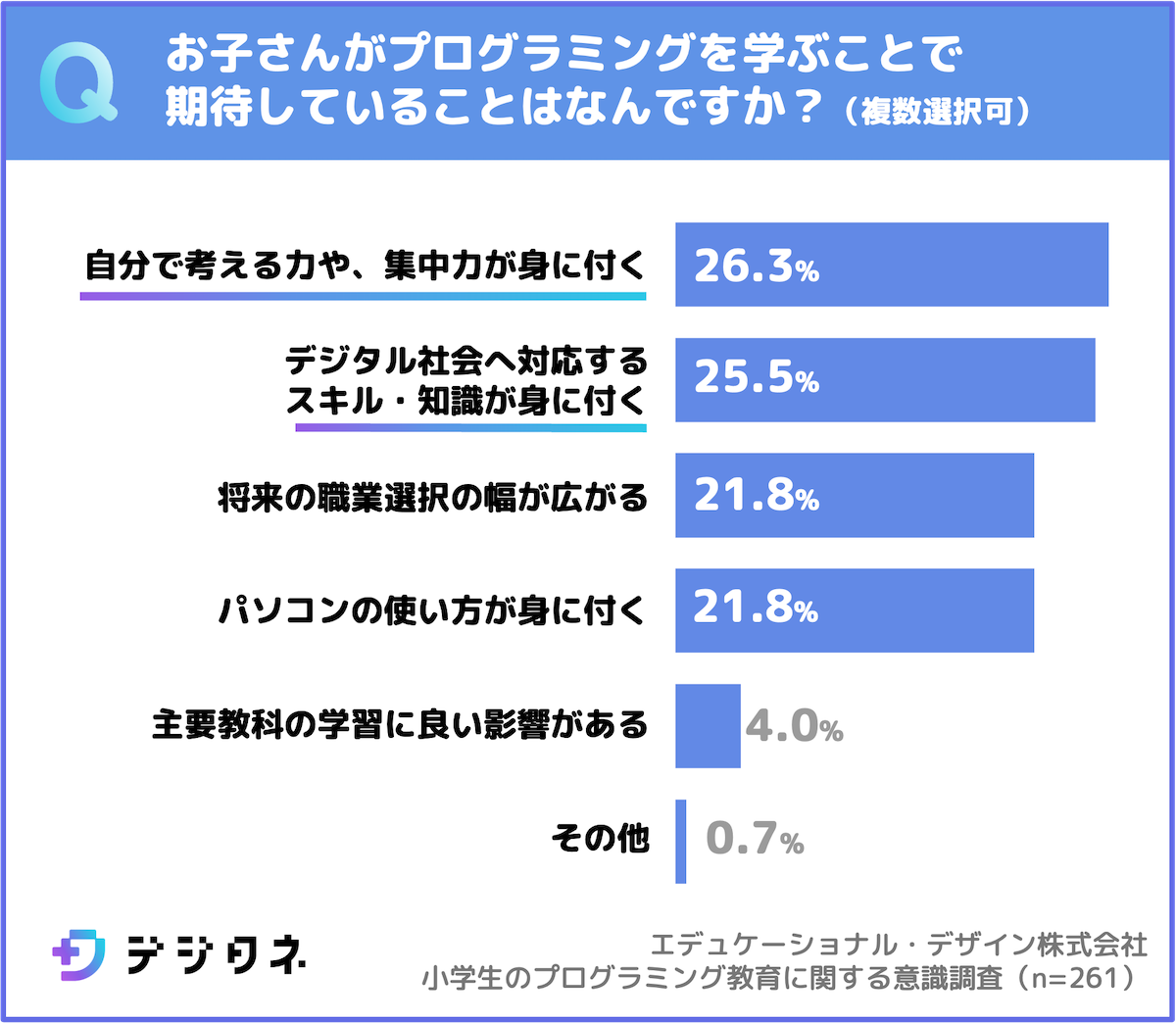 プログラミングを学ぶことで期待していることとして、保護者の26.3%が「自分で考える力や、集中力が身に付く」を選択、次いで、25.5%が「デジタル社会へ対応するスキル・知識が身に付く」や、「将来の職業選択の幅が広がる」ことへの期待が高いこともわかりました。