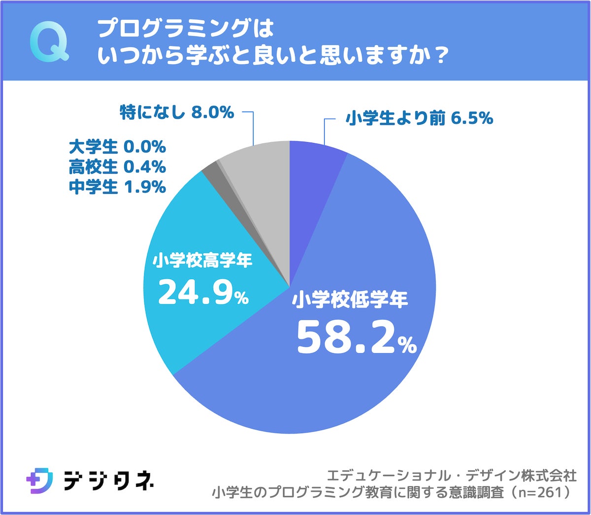 「プログラミングはいつから学ぶと良いと思いますか?」という質問に対し、保護者の58.2%が「小学校低学年」、24.9%が「小学校高学年」と回答しています。