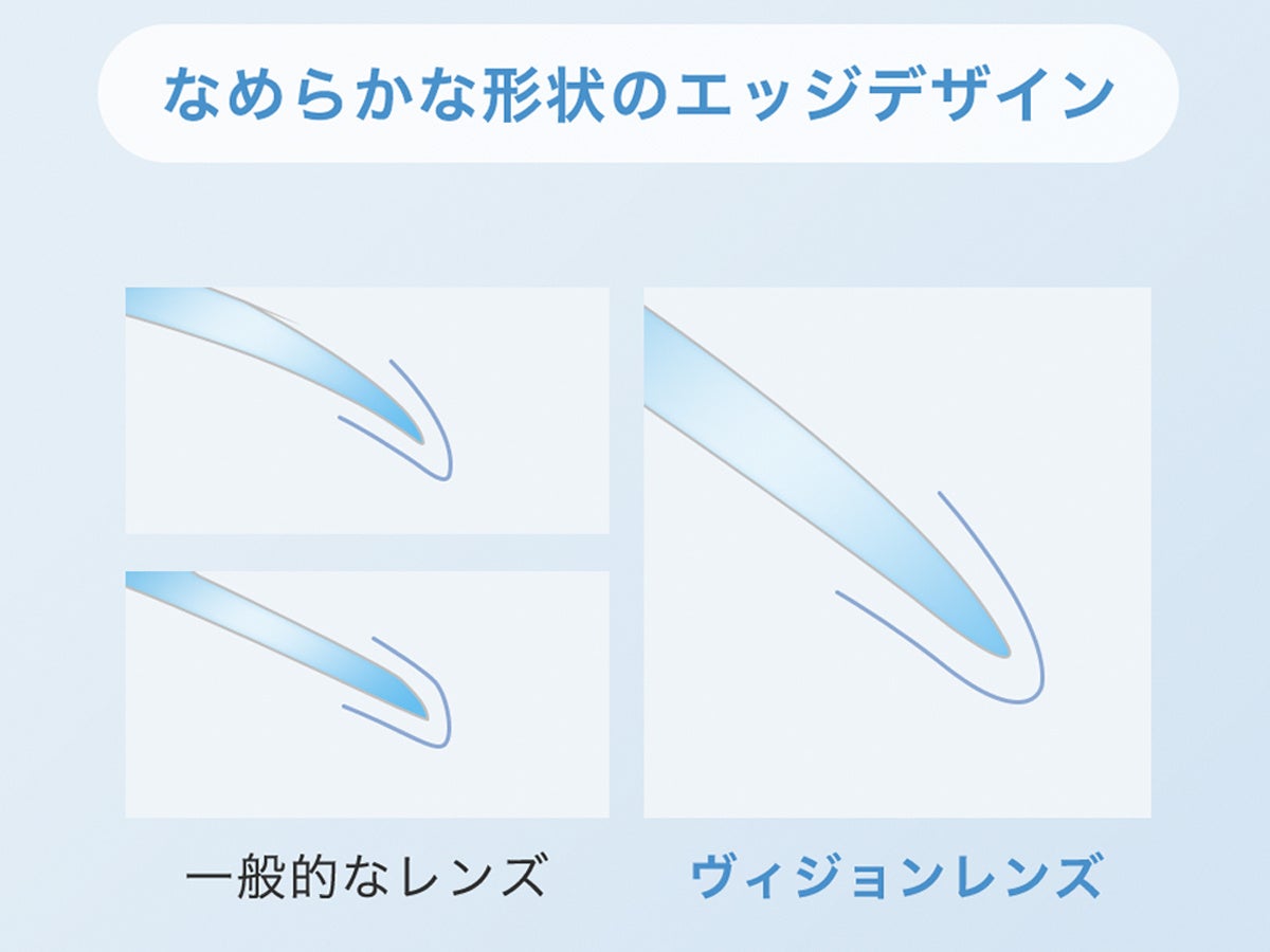 レンズのエッジ(先端)部分がなめらかな形状の「マルチカーブレンズデザイン」を採用。心地良いフィット感、さらにはレンズと目が触れる部分の摩擦が軽減され、快適なつけ心地を維持することができます。