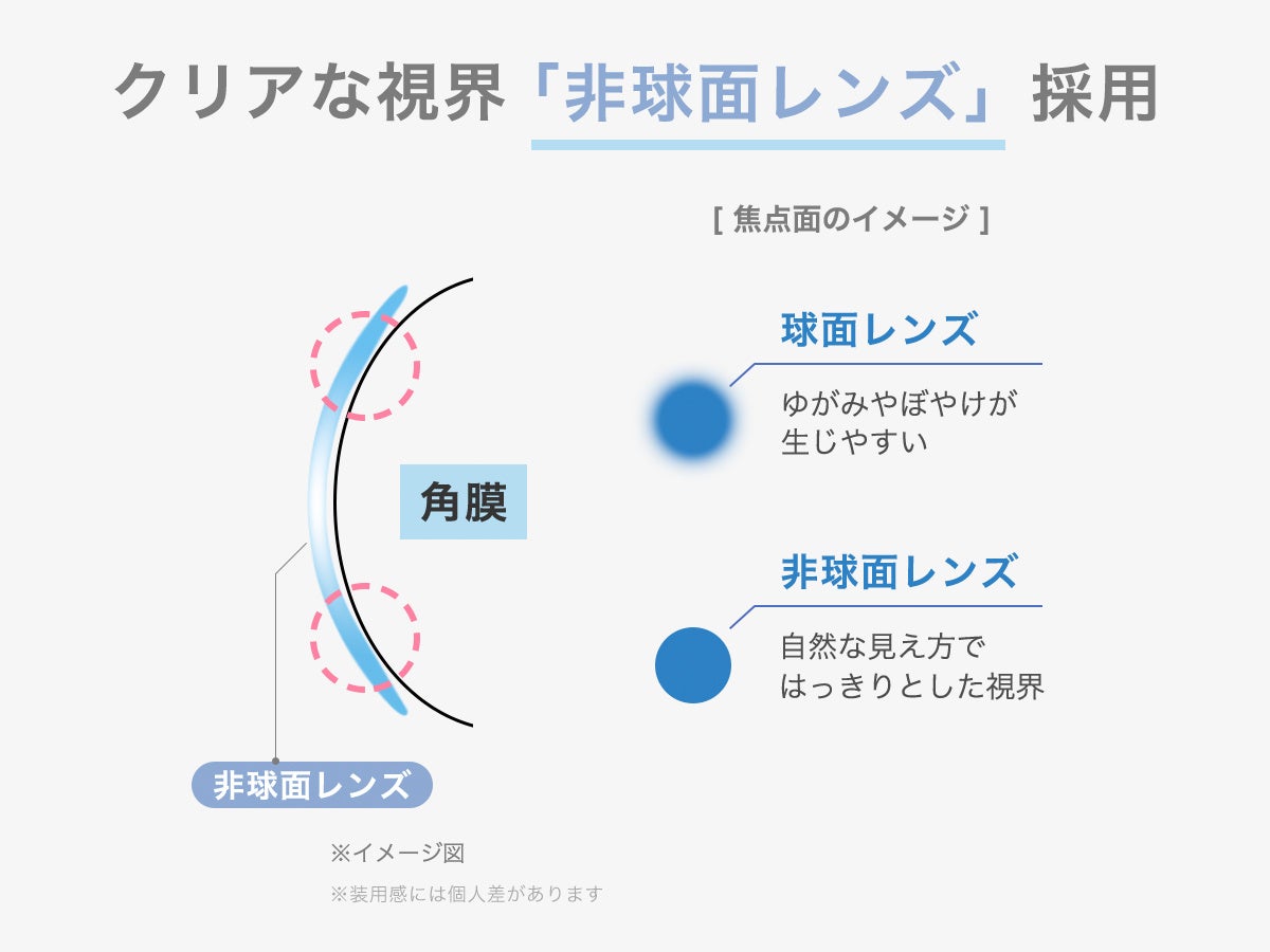 レンズのカーブを浅くすることで、瞳のカーブとしっかりフィットします。視界がゆがんだりぼやけるのを軽減することで、クリアな視界を確保します。