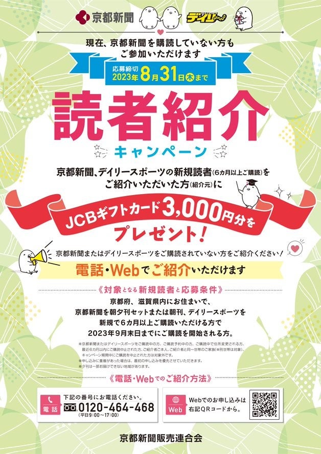 京都新聞は読者紹介キャンペーンを実施中です。京都新聞、デイリースポーツの新規読者(6カ月以上ご購読)をご紹介いただいた方(紹介元)にJCBギフトカード3,000円分をプレゼントします。