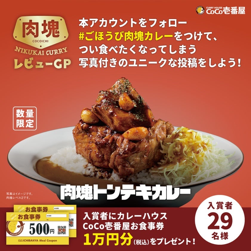「肉塊トンテキカレー」の販売に合わせて、「肉塊レビューGP(グランプリ)」を開催いたします。「肉塊トンテキカレー」の写真と「#ごほうび肉塊カレー」をつけて、X(エックス)にポストしてください。より多くの5月疲れを感じる方へ「ごほうび肉塊カレー」の情報を届けてくれた、そんなバズ投稿を表彰します。厳正なる審査の上、入賞者29名様にカレーハウスCoCo壱番屋お食事券1万円分(税込)をプレゼントいたします。