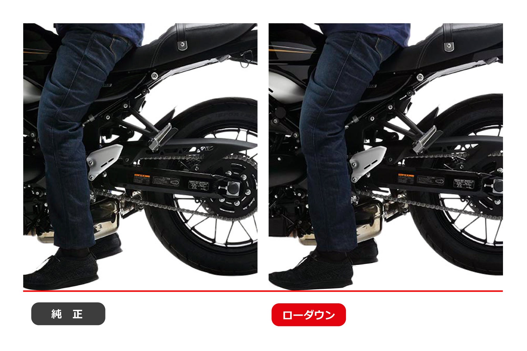20mmダウンのローダウン量で、足つきを改善。「信号待ち」や「一時停止」といった、停車時の不意の「ふらつき」などの不安を払拭することで、ライディングに余裕が生まれることで、ストップ&ゴーが多い街中でも気疲れしない。安心して足をつける。楽に取りまわせる。落ち着いて交差点を曲がれる。また、エフェックスのローダウンキットは純正の乗り味を悪化させないよう、スタンダード車両のリアサスペンションの特性を分析し、「サスペンションの動きを活かすこと」を前提に開発。車種毎にダウン量を適切に設定することで、足つきの不安感無く、乗ってもしっかり楽しい、充実したバイクライフを実現することができます。