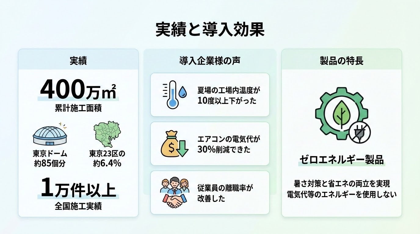 累計400万㎡は、東京ドーム約85個分、東京23区の面積の約6.4%に相当します。これまでに全国1万件以上の施工実績があり、工場・倉庫の暑さ対策や省エネ対策、住宅の快適性向上に貢献してまいりました。