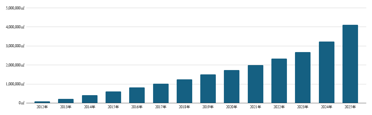 サーモバリアは2008年の販売開始以来、工場・倉庫を中心に住宅まで幅広い施設で採用され、年々販売面積を伸ばしてまいりました。特に近年は、脱炭素経営やSDGsへの関心の高まりを背景に、省エネ対策として導入する企業が増加。近年は、年間100万㎡に届くペースで販売を続けています。