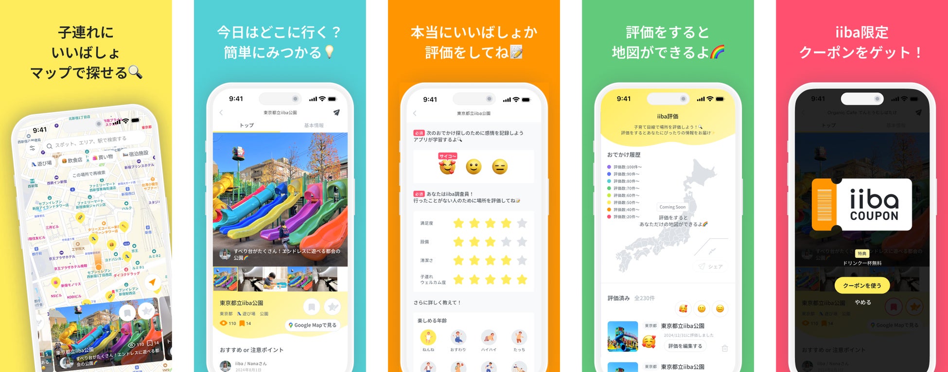 iibaは「子育てをもっと楽しく、便利にする」ために、親の負担を減らし家族の笑顔の時間を増やすためのサービスです。現在iOS、Androidでリリース中のアプリは、遊び場や飲食店、授乳室やトイレに至るまで、子育て中のママパパが選んだ「いい場所」をMAP上で発見できる他、iiba限定クーポンを利用できるなど、子育て世帯の外出をサポートする機能が満載のアプリです。