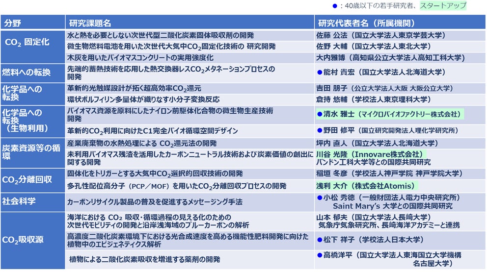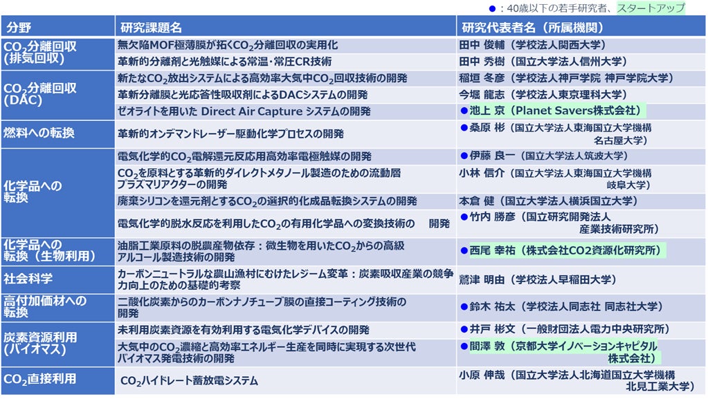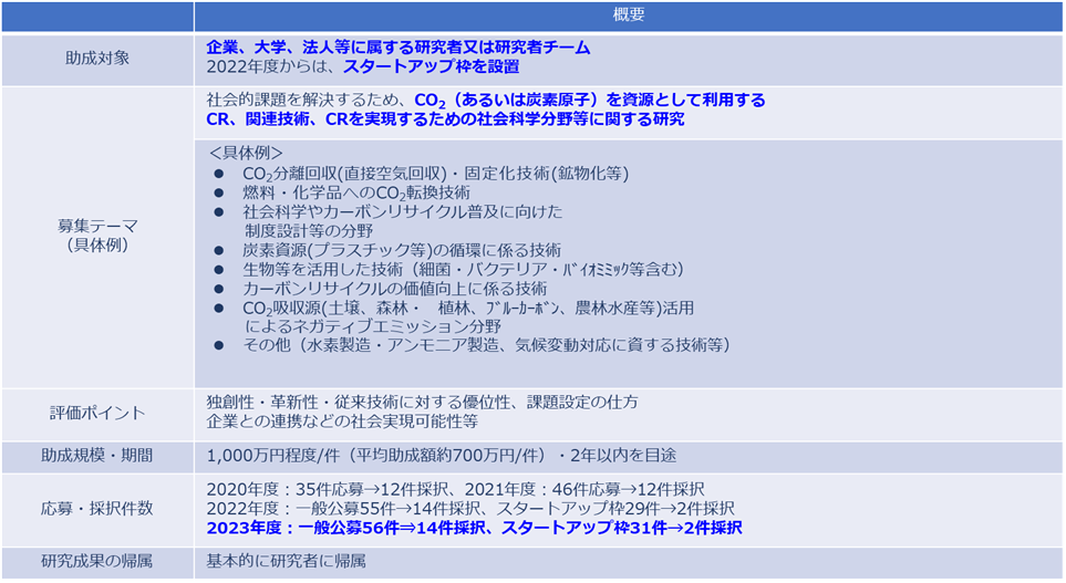 ● 研究者(研究チーム)に対して、CO2吸収源活用などのネガティブエミッション分野や社会科学等も含む広範囲なカーボンリサイクルに係る研究に対して助成をする制度です。