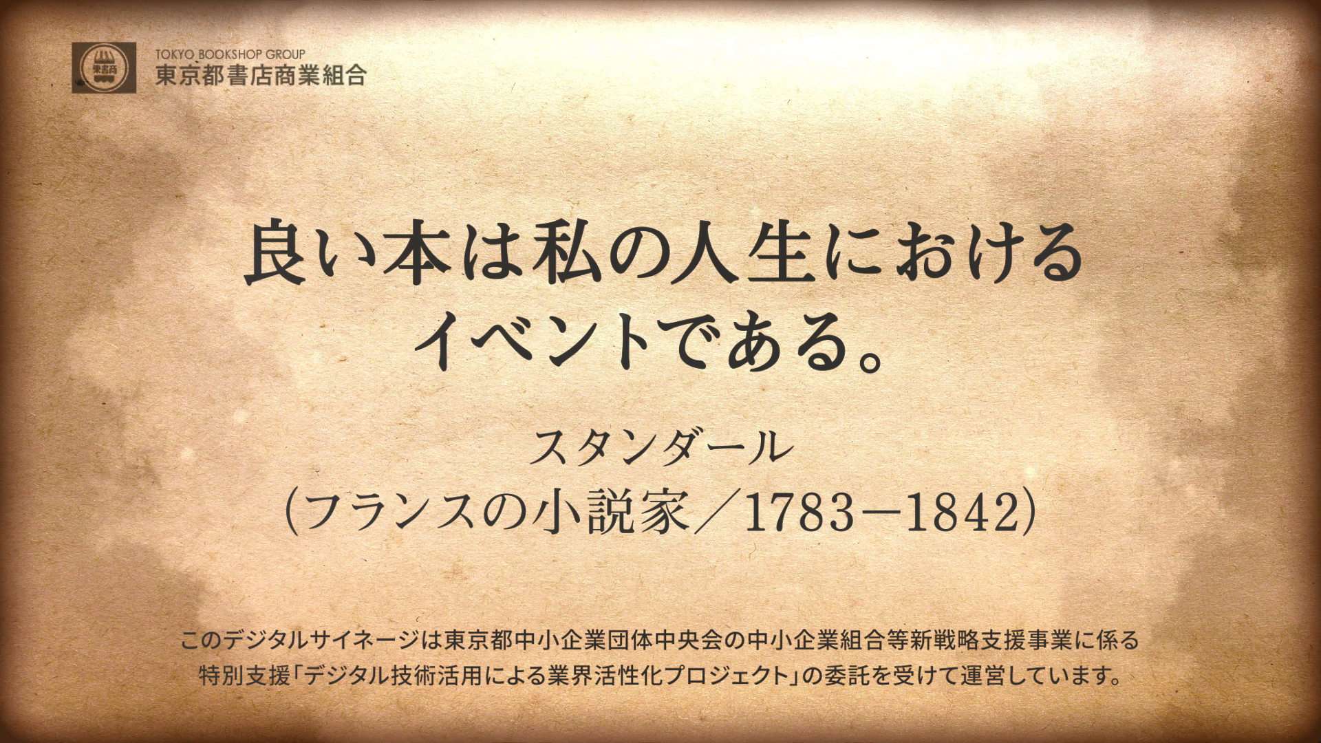 本に関係するCMなどの動画を放映するデジタルサイネージを東京都75書店に導入。東京都書店商業組合オリジナルコンテンツも放映中!