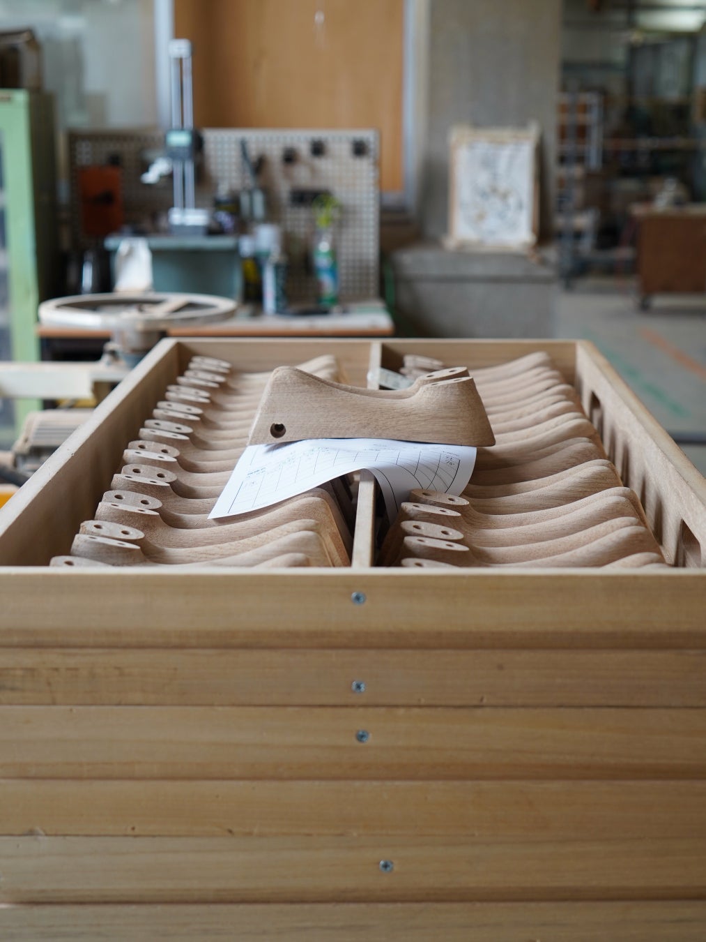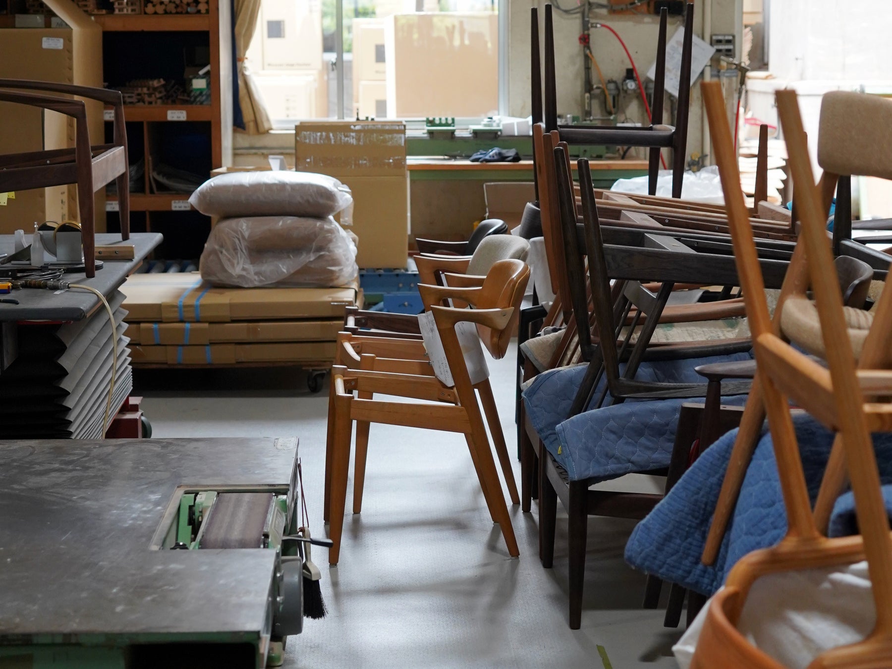 次に、生産している人の顔や生産現場の空気感が目に浮かぶことです。ヴィンテージ家具が生産されていた時代に想いを馳せることも心躍りますが、どのような人達が生産に携わっているかとイメージできることは、お客様へご提案する側にとって大切な要素であると考えています。弊社が考える宮崎椅子製作所のモノづくり要素の一例として、相手を敬い、思いやりを持って家具づくりに取り組んでいると感じさせてくれるところです。その想いがあるからこそ、今まで出来なかったことにも挑戦し、高品質な家具を作り続けることが可能であると信じています。