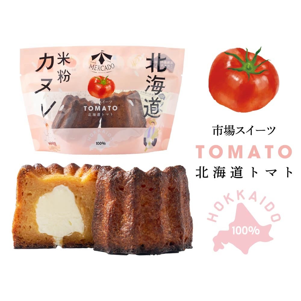 MERCADO(メルカド)ブランド第一弾は、北海道の魅力溢れる農産物”トマト”のスイーツ。北海道産の「牛乳」「てんさい糖」「米粉」「バター」「トマト」をふんだんに使用した北海道カヌレです。