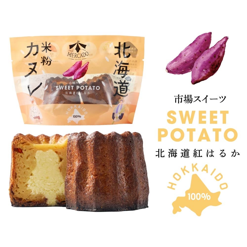 MERCADO(メルカド)ブランド第一弾は、北海道の魅力溢れる農産物”さつまいも”のスイーツ。北海道産の「牛乳」「てんさい糖」「米粉」「バター」「さつまいも」をふんだんに使用した北海道カヌレです。