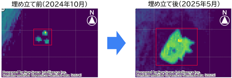 NSIは、複数の衛星データを対象に、画像の選択・統合・解析・提供といった一連のプロセスを「パイプライン」として自動化する技術を有し、またMRIは衛星データ利用の社会実装に向けた調査検討や実証の実績のほか、安全保障分野に関する実績・知見が豊富にあります。こうした互いの強みを活かし、NSIとMRIは現在、衛星データ等を活用した国内外向けインテリジェンス・サービスの開発に取り組んでいます。2024年のPoCでは、過去の衛星データを用いて島しょの埋め立て活動等に伴う地形の変化の検知が可能であること等を確認しました。