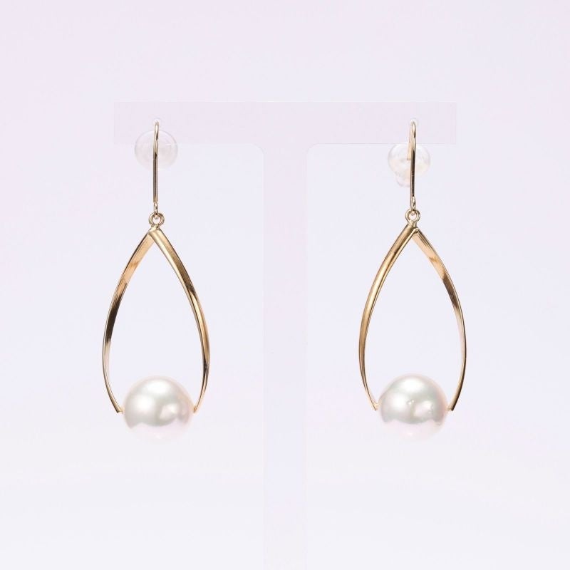 金属のモチーフにパールを留めて、上品なピアスに仕上げました。フックタイプでひねりを加えてありますので、とても品があり都会的な印象でお召いただけます。あこや真珠は一様な2珠を用意いたしました。照りがよく高級感を楽しんでいただけます。